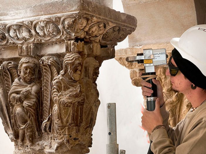 La técnica de láser que se está utilizando en la limpieza de los capiteles del claustro de la catedral de Tudela parece un truco de magia. Los expertos, en un trabajo muy minucioso, enfocan con un láser el capitel y, de forma instantánea, desaparece la suciedad y muestran su ‘nueva cara’ o, en realidad, la que tenían hace 800 años.